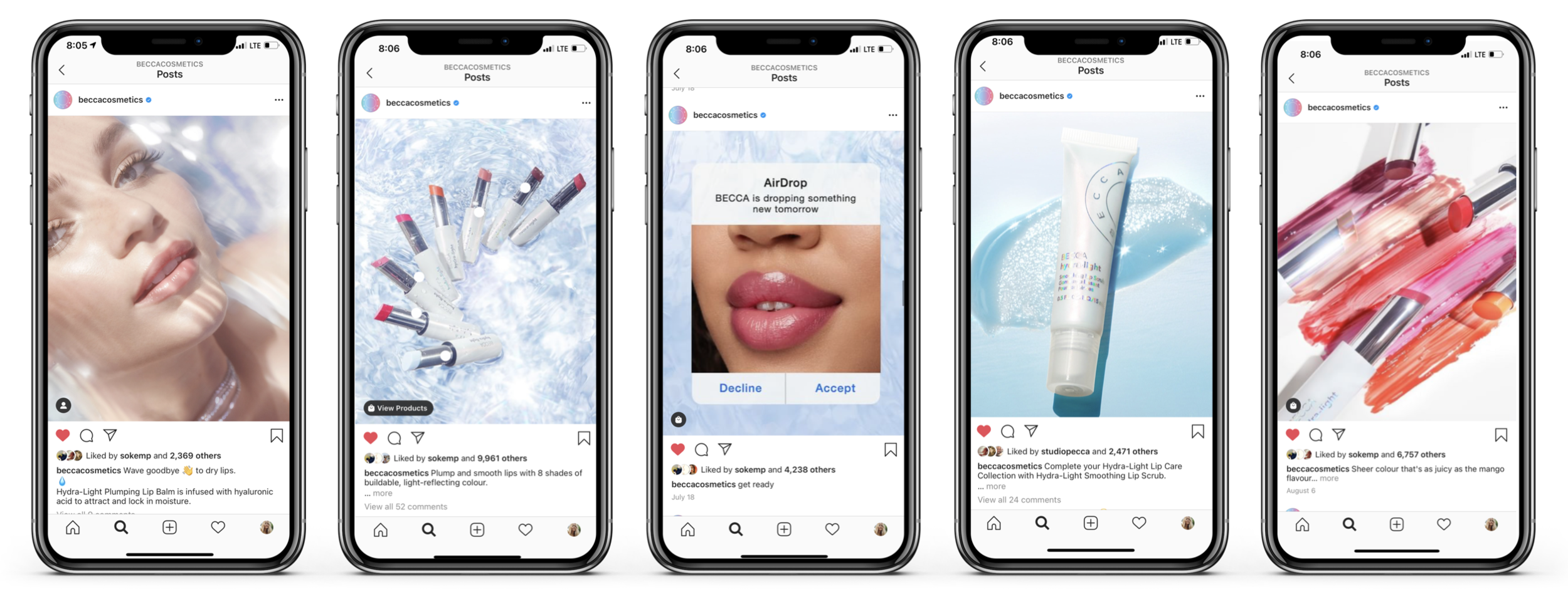 For this specific campaign, I partnered with BECCA’s creative director and lead the production of the new Hydra-Light Lip Collection. My role consisted of creating shoot decks, assisting in pre-production planning, art directing on set, making selects and directing the video editors in the hero and paid social cuts. I also directed the final creative design of the campaign for asset collateral such as emails, social teasers, paid ads and displays.